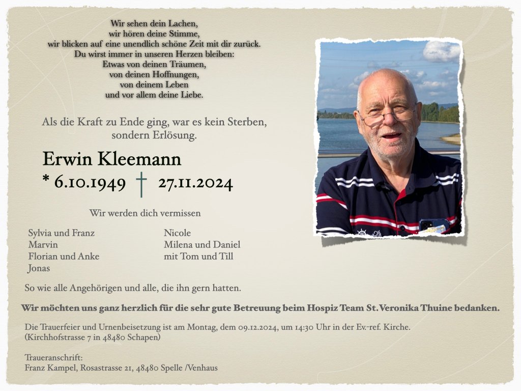 Ich erinnere mich an Erwin als einen hilfsbereiten Menschen. Damals auf dem Rückweg von Ahaus nach einem Besuch. Bei meinem Großvater sind wir mit dem Auto liegen geblieben.